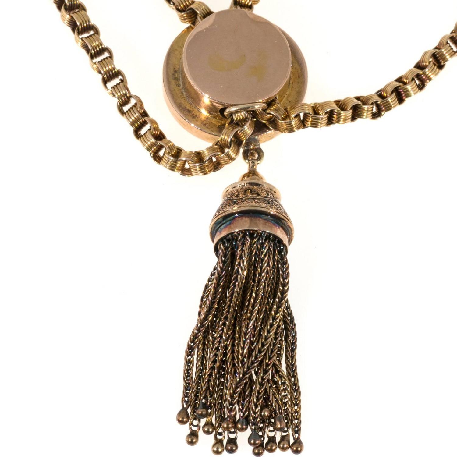 A LADY'S GOLD FOB WATCH, keyless movement, with white porcelain roman dial, with gilt highlights (lacks minute hand), the case foliate engraved, ON A GOLD CURB PATTERN LINK ... Read Document